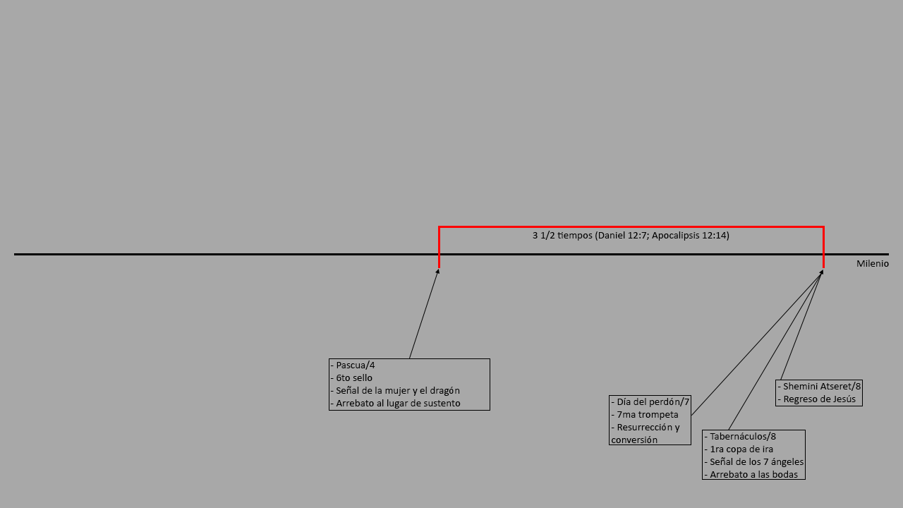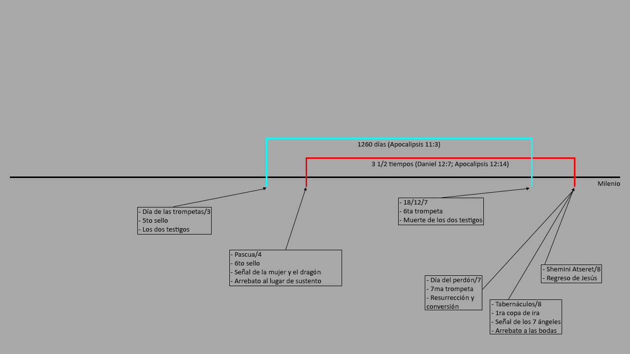 En el día de las trompetas se levantarán los dos testigos a causa de la sangre derramada que clama a Dios para anunciar la ira que vendrá en pocos meses; esto es el quinto sello; los dos testigos son un príncipe y un sacerdote, ambos con el poder de Elías por lo cuál nadie los puede matar, y son los mediadores del próximo pacto; su testimonio: el arca del pacto hallado por Ron Wyatt con las tablas de los mandamientos, con esto los dos testigos harán recordar a Israel su pacto. Llegando a cierto grado de apostasía, será interrumpido el sacrificio del templo. Día de Pascua, llega en el cielo un astro terrible, un planeta cometa rojizo desde las afueras del sistema solar, que lleva arrastrando consigo asteroides del cinturón, este planeta se posicionará al lado de la constelación de Virgo, con el sol delante y debilitado en luz, dejando visible la señal; esta es la señal de la mujer y el dragón; y en esto, los asteroides que arrastraba el planeta caen a tierra, y su gravedad desencadenará el gran terremoto que moverá islas y continentes; esto es el sexto sello. El planeta dejó un caos en el espacio, muchos asteroides del cinturón moviéndose por todos lados, esto representa la batalla de Miguel y sus ángeles, y los asteroides que pasan delante de Virgo representa el sustento de la mujer; y su corona de 12 estrellas es creado por las 9 estrellas de Leo más 3 planetas y representan a los 12 apóstoles. En ese momento la duración del año cambia nuevamente. Al mismo tiempo que los asteroides caen a la tierra, Satanás y sus ángeles caen también; ay de los moradores de la tierra, porque estos demonios caidos poseerán a muchos, posiblemente a quienes recibieron la marca, pues al que recibe la marca hizo un pacto con Satanás, y serán dificiles de matar, esto es la bestia escarlata. En el mismo día también, los creyentes en Jesús serán trasladados desde todos los lugares del mundo a un lugar de refugio en el desierto de Arabia (mujer con alas de águila), y allí serán sustentados como fue sustentado Israel en el desierto, seran llevados a aguas especiales que puede quitar cualquier enfermedad e impureza ritual; el tabernáculo de Dios aparecerá dimensionalmente para protegernos de sol en tanto que estemos en el desierto, y allí nos alegraremos celebrando su salvación. La bestia escarlata, los poseídos, intentarán alcanzarlos, pero la tierra se abrirá y se los tragará cayendo vivos al seol, y quienes no hayan caído no los podrán alcanzar.