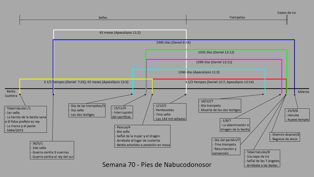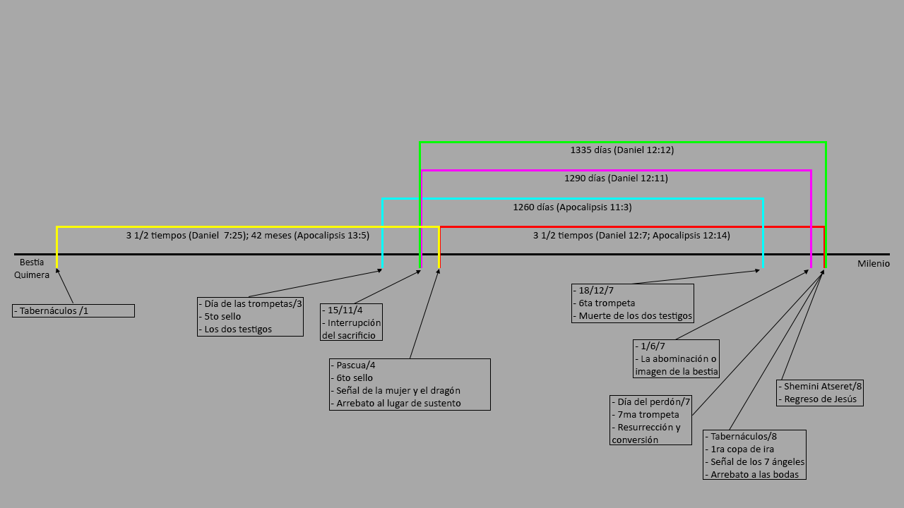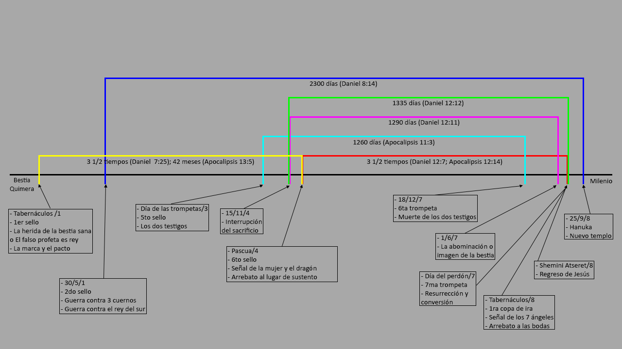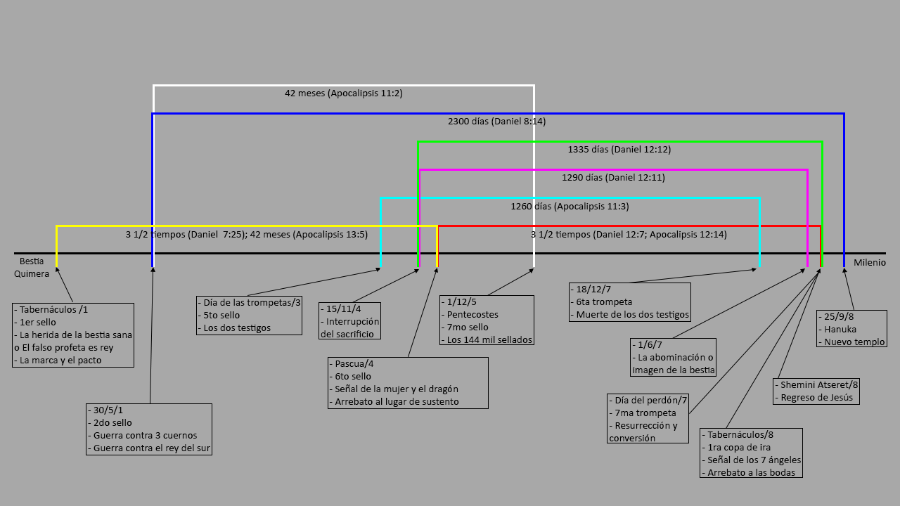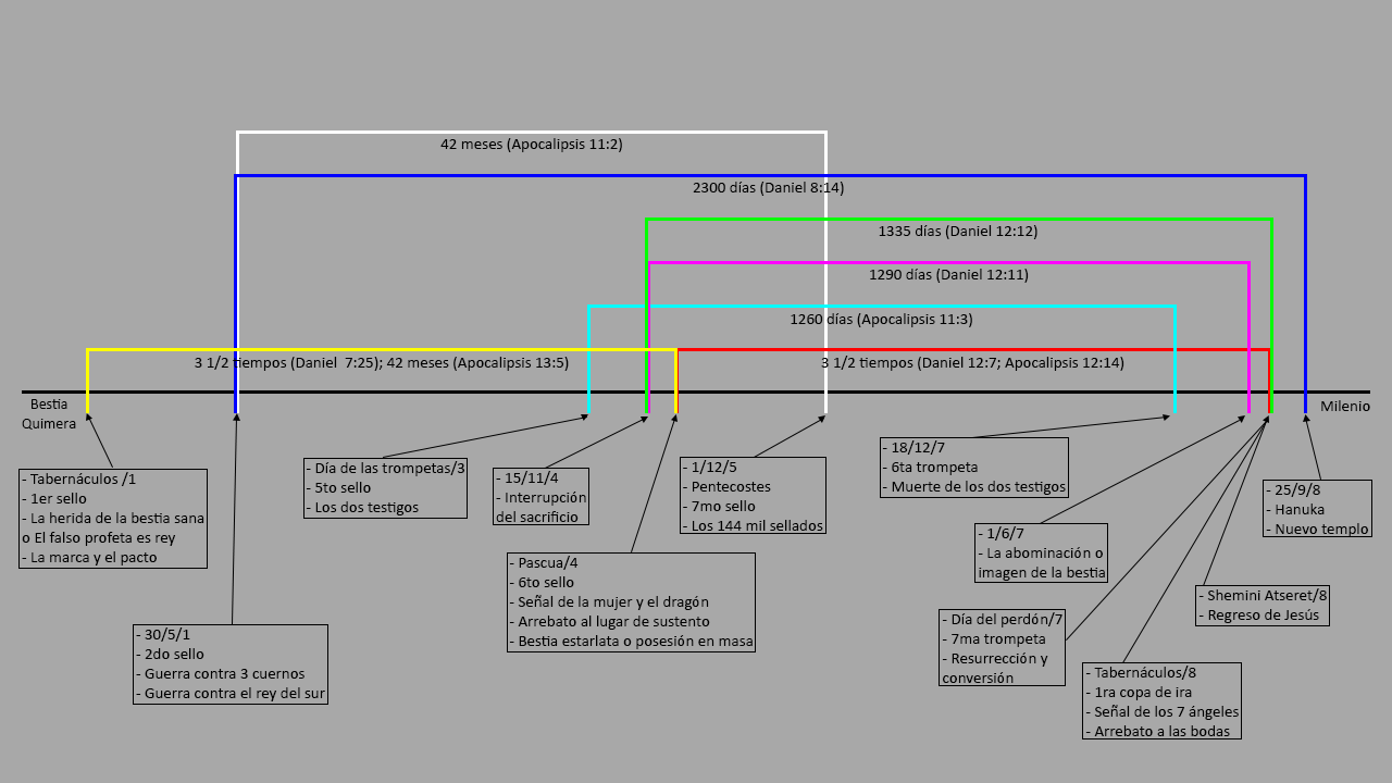 Acabamos de usar todos los datos cronológicos que nos da Daniel y Apocalipsis; al completar toda la cronología, vemos algunos patrones; a la mitad y final del periodo del apocalipsis, ocurren dos conjuntos semejantes entre sí de 4 eventos; tenemos dos eventos de prevaricación del templo, que son la interrupción del sacrificio y la abominación; dos eventos de ira, que son el sexto sello y las copas de ira; dos arrebatos que son al lugar de sustento, y a las bodas del cielo; y dos señales astronómicas, la mujer con el dragón, y los 7 ángeles con las plagas. Otro patrón que podemos apreciar es que al inicio es liberada la bestia quimera, y a la mitad del periodo es liberada la bestia escarlata, primero lo terrenal y luego lo espiritual, igual que el orden en que Dios hacía las cosas. Otro patrón es que todas las fiestas de Dios aparecen en las profecías, incluyendo Hanuka que es una fiesta solar. Y por último, vemos que desde el primer evento del apocalipsis, cuando el falso profeta se hace rey, hasta el último evento, la purificación del templo, son 2618 días; ese es el número de años entre el 539 AEC cuando Judá regresa del exilio en Babilonia hasta el año 6001 de la creación; ambos periodos son sobre tribulación de Judá. Y el último patrón, el más grande, el santo grial de la escatología, el día y el año del arrebato; sabemos que la resurrección debe ocurrir en el sexto milenio, y que el reino de Jesús empieza en el séptimo, y entre ambos eventos hay poco tiempo; y sabemos la fechas de la resurrección y el arrebato, que son el día del perdón y Tabernáculos respectivamente; entonces el arrebato debe ocurrir en el año 6000; y eso no es todo; con lo anterior podemos también saber la fecha del inicio del apocalipsis; si hablamos de 7 ciclos de 364 días entonces también hablamos de 7 años, porque en cantidades pequeñas de tiempo, la diferencia entre ambas escalas de tiempo es pequeña; el primer evento del apocalipsis tendría lugar en Tabernáculos del año 5994; en años gregorianos sería el 2073.