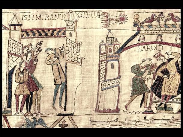 Esta imagen es el tapiz de Bayeux y muestra lo que se vio en el año 1066, un enorme astro rojo con cola en el cielo que se puede apreciar en la parte alta de la imagen; y esto esta también testificado en la Crónica Anglosajona, que dice en ese tiempo se vio en toda Europa un portento en el cielo, como una estrella con una larga cabellera.