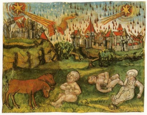 Esta imagen es una ilustración que aparece en la Crónica de Lucerna escrita en el año 1513, según la narración el evento ocurrió en el año 1456, noten que se avista dos cometas, los cuales están generando varios desastres, una lluvia de meteoritos, un terremoto, y gas tóxico que dejaba a personas sufriendo y a los animales con malformaciones.